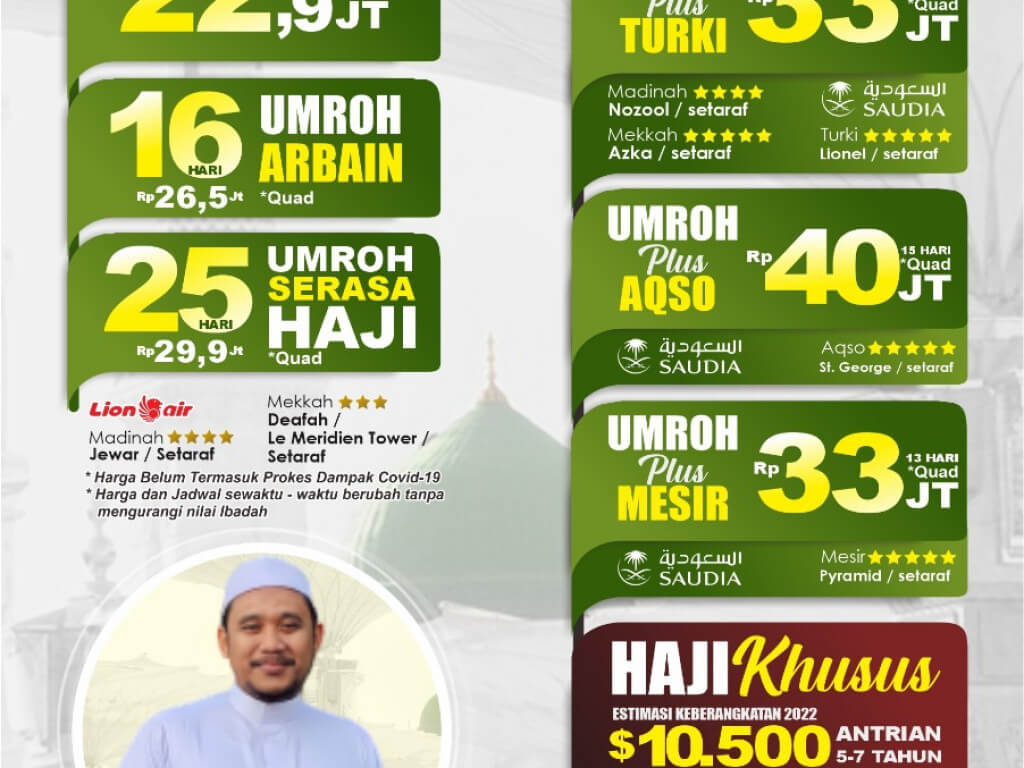 - Jadwal & Harga dapat berubah sewaktu-waktu tanpa mengurangi nilai Ibadah sesuai dengan Kebijakan Pemerintah Saudi dan Indonesia